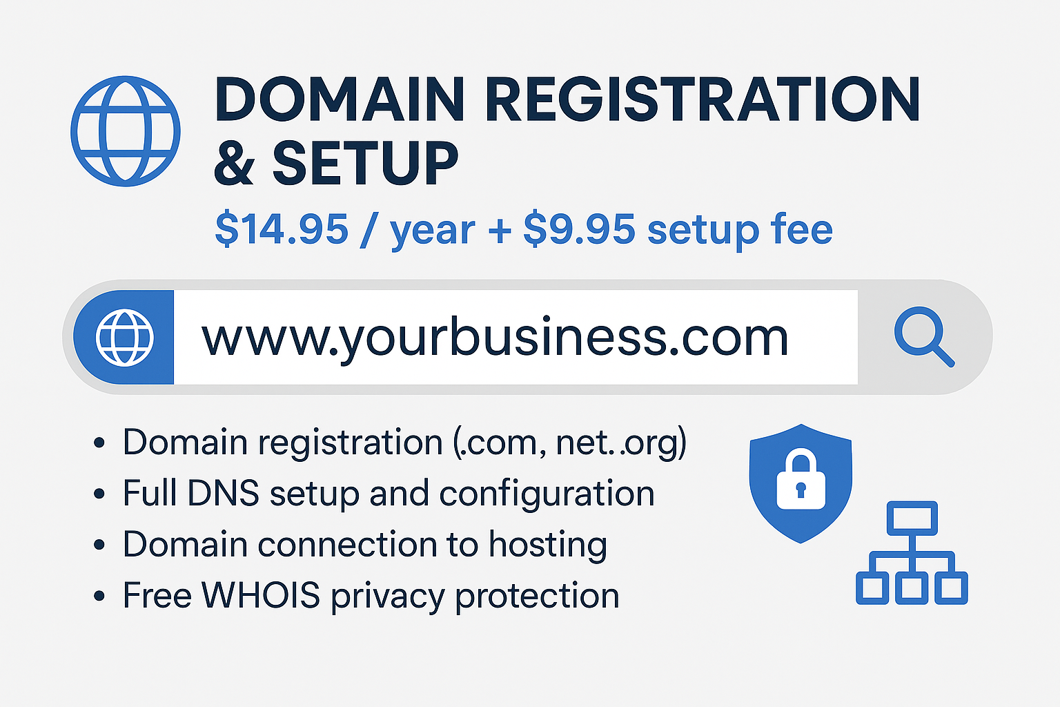 Secure your online identity with a custom domain name. Weโ€™ll help you register your domain (yourbusiness.com, .net, .org, etc.) and fully configure it to work with your hosting account. Our team will set up your DNS records, connect it to your website, and ensure your domain is ready to go live โ€” no technical knowledge needed.